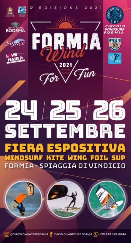 TERZA EDIZIONE WIND for FUN 2021 a Formia che si terrà dal 24-25-26 settembre. Prove di attività acquatiche (windsurf, sup, kite surf e vela) aperte a tutti! Esposizione delle più grandi aziende produttrici e surf shop di articoli acquatici che vi faranno toccare con mano prodotti di altissima qualità!