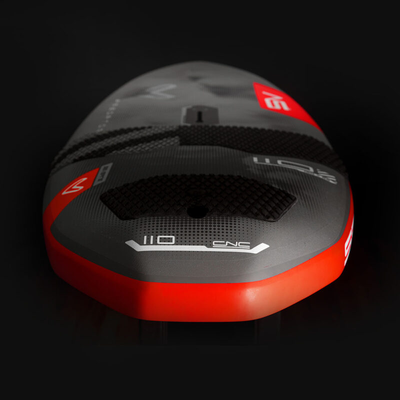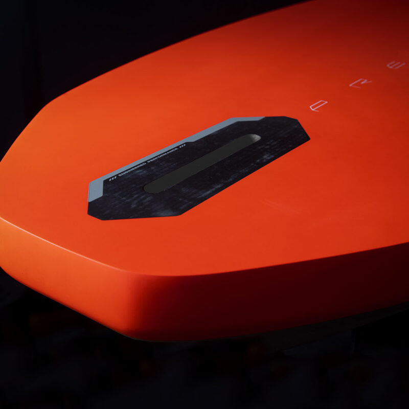Designed to be ridden with both feet in the straps during moves, or with the back foot out on the rail when blasting. Inserts are only inboard for the back foot – this forces the rider to keep their weight directly over the foil when jumping or loading up the foil, and massively reduces leverage and the chance of breakages. As a true windsurf board, a deep-tuttle box is used for reliability, consistency, and ease of use. Excess inserts and finboxes have been eliminated, increasing simplicity and reducing weight.